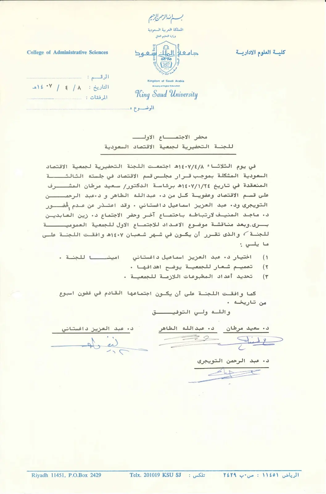 خطاب رئيس قسم الاقتصاد بالدعوة إلى الاجتماع الأول في عام 1987م (1407هـ)